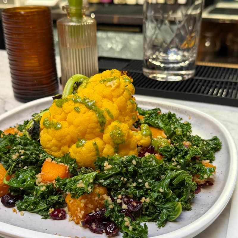 Cauliflower, couscous, roasted squash, kale, cranberries with red wine vinegar dressing & herbed green sauce. add chicken +4 add avocado +3