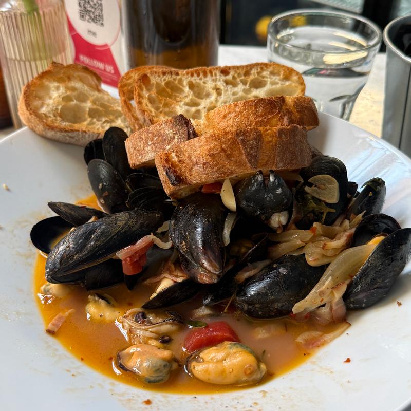 Mussels, garlic, onion, tomato, white wine, bacon, oregano, chives, chili flakes